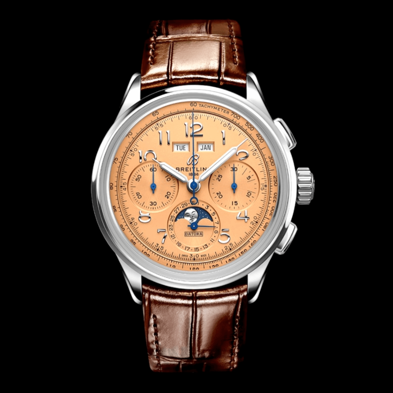| Watch Features | Hours, Minutes, Subsidiary Seconds, Day, Date, Month, Moonphases & Chronograph with an Outer Tachymeter Scale. Water Resistance: 100 Meters |